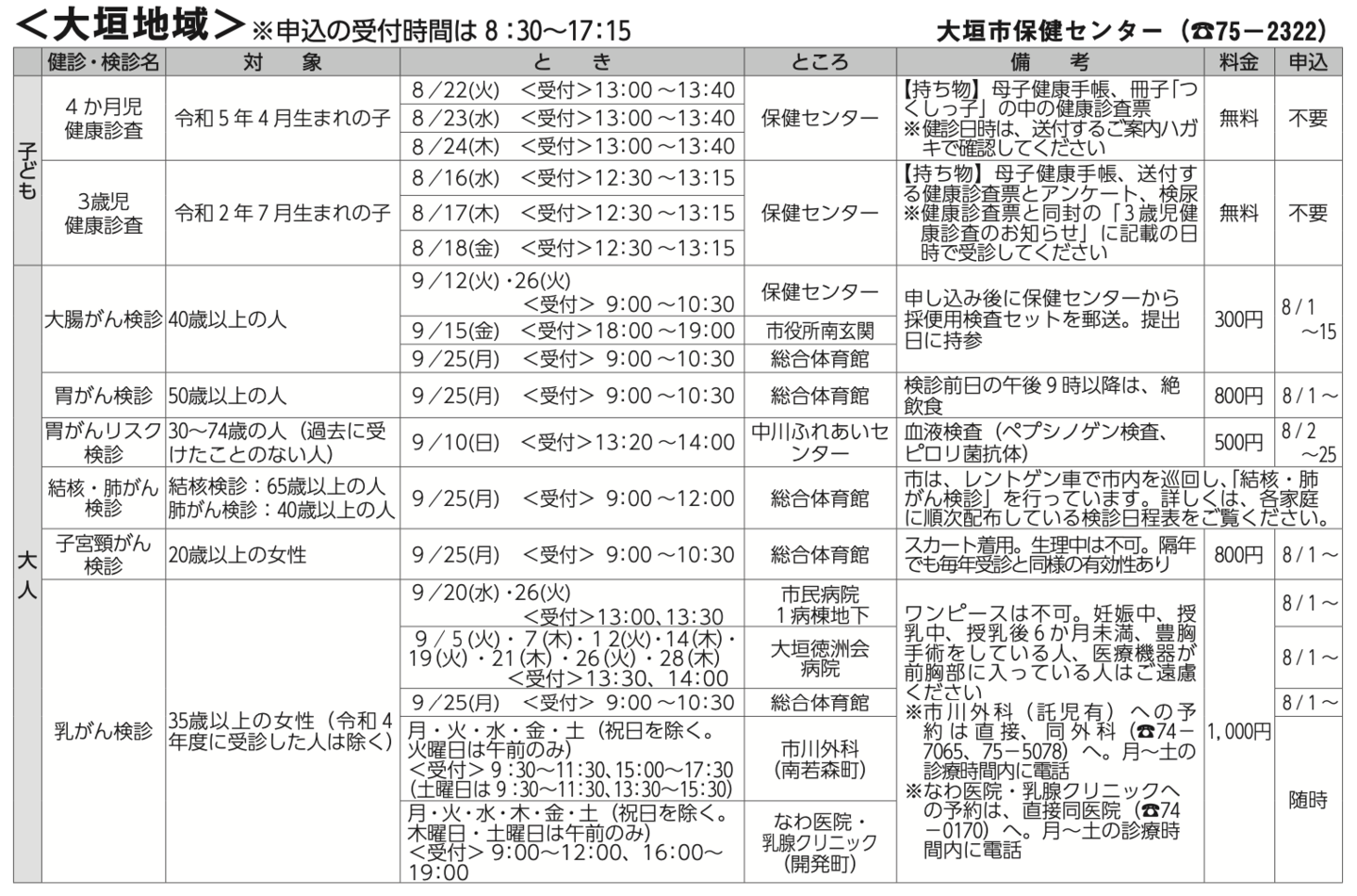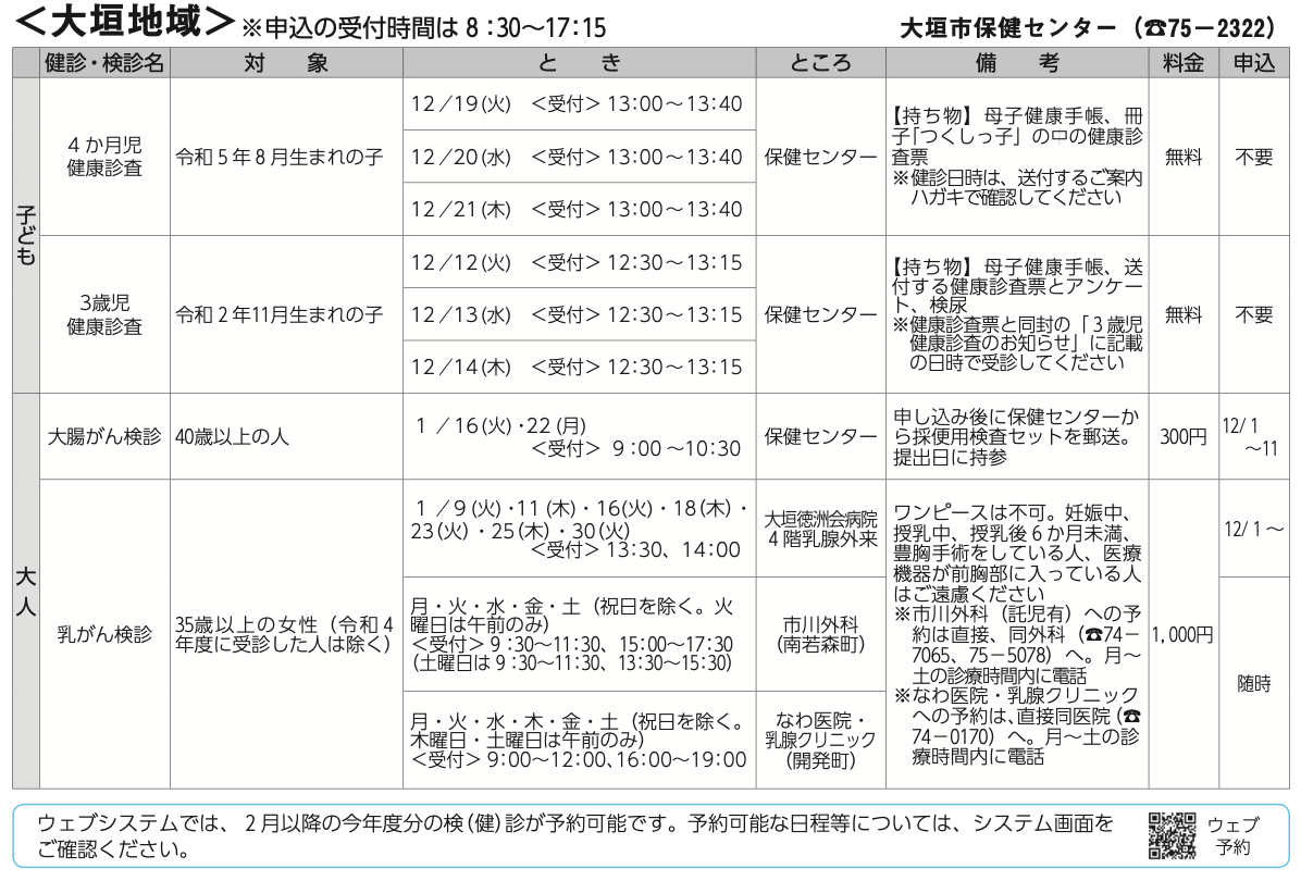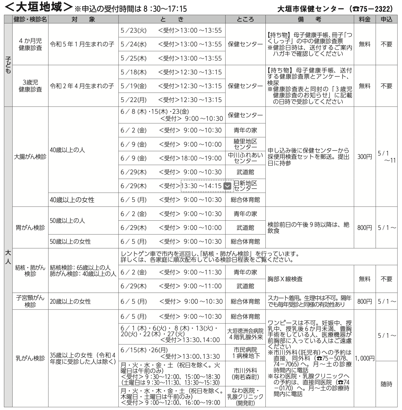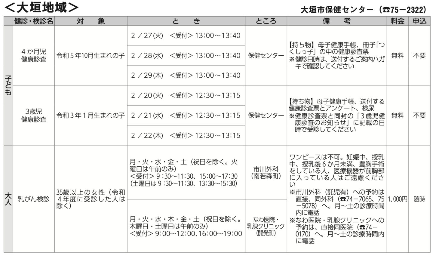 また、大人の検診も掲載し、地域についても大垣、墨俣、上石津等を掲載しております。