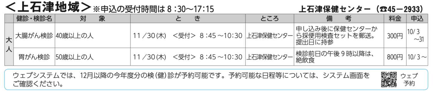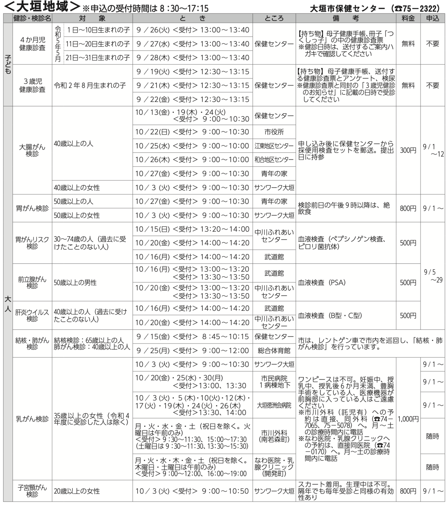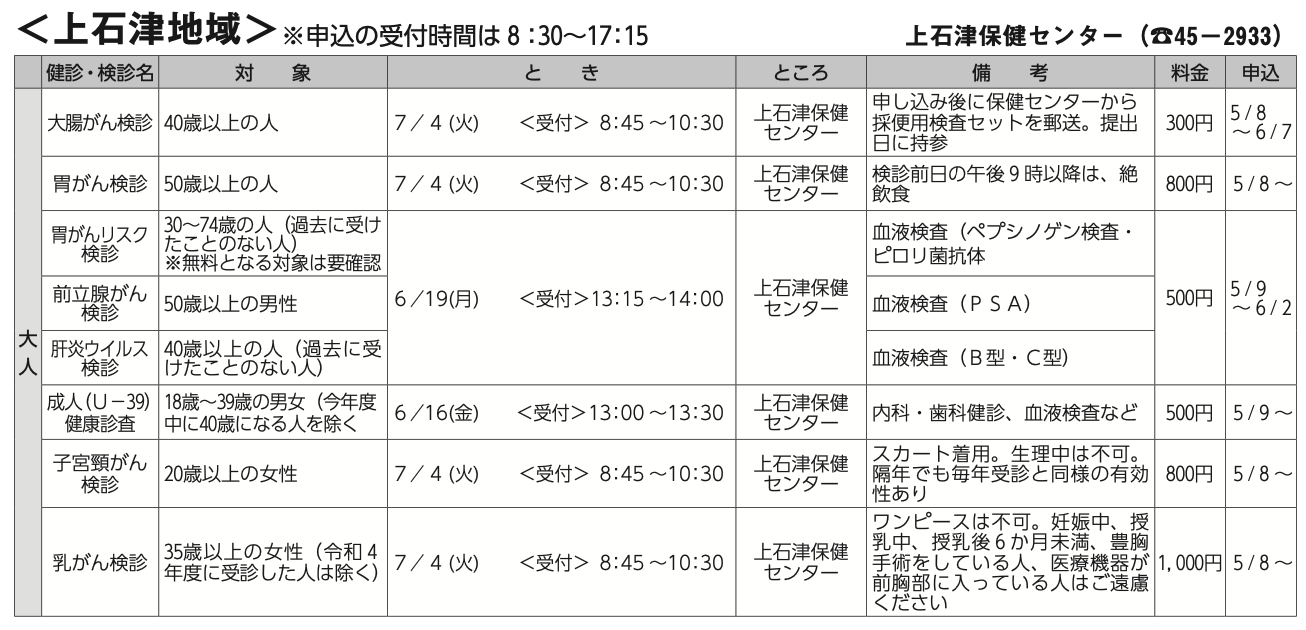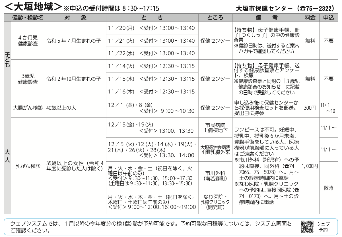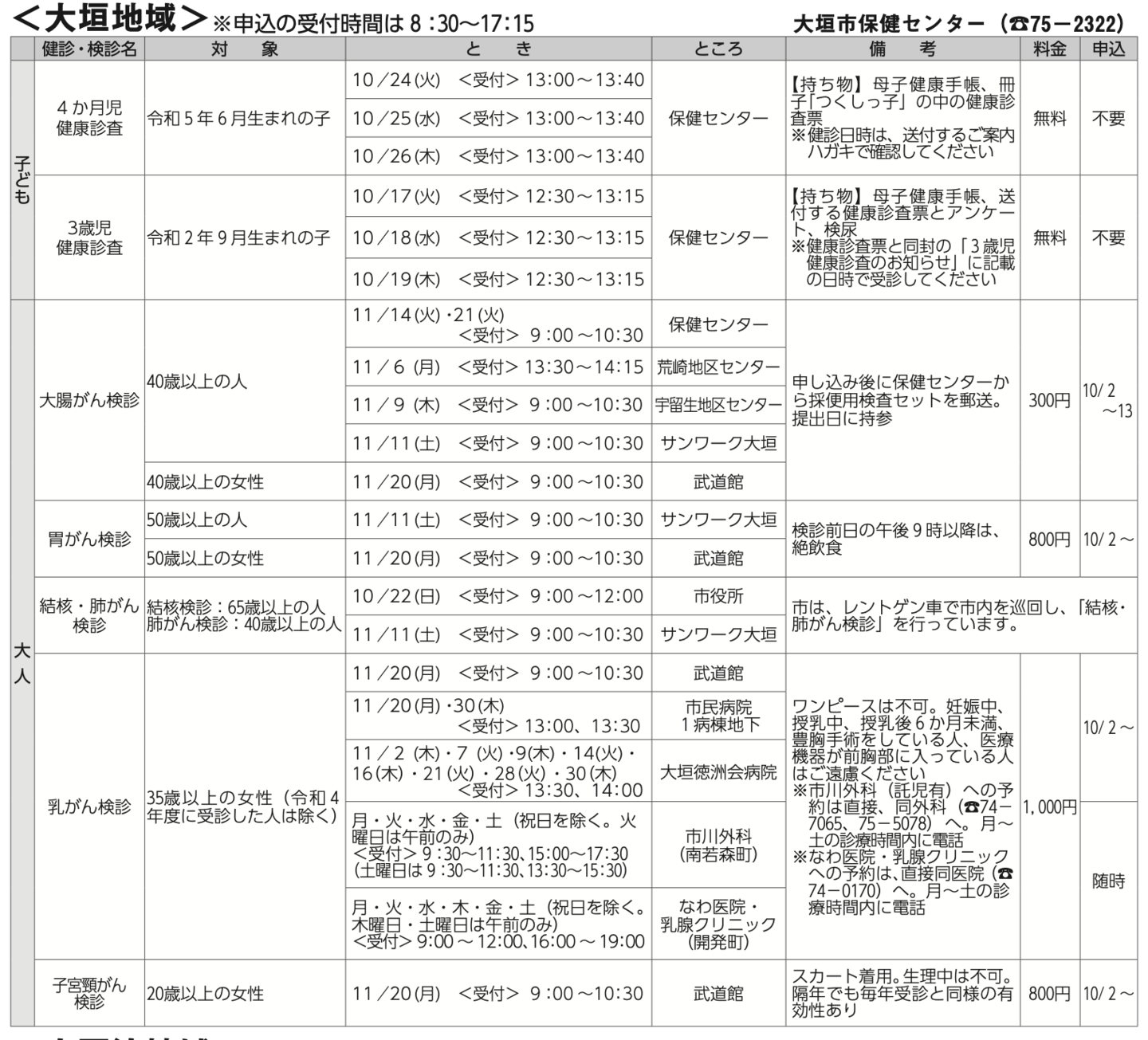 また、大人の検診も掲載し、地域についても大垣、墨俣、上石津等を掲載しております。