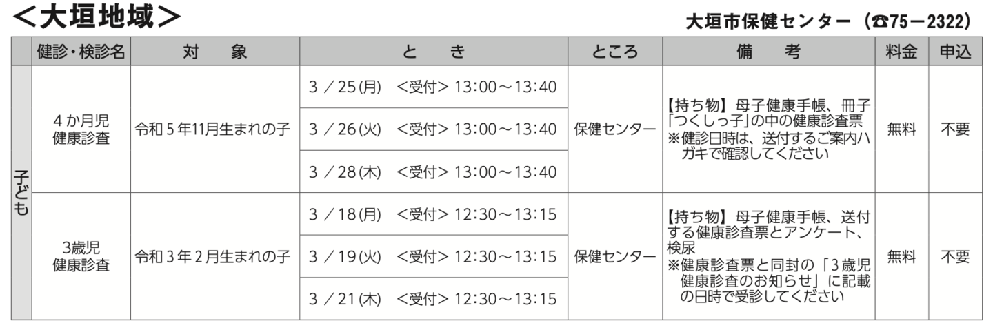 子どもの定期検診の時期は広報大垣にて確認できますが、忘れてしまうとの意見からこちらでも確認できるようにしました。