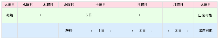 | ※発熱した日、解熱した日は含めません。両方を満たした日数で登園可能です。 |
